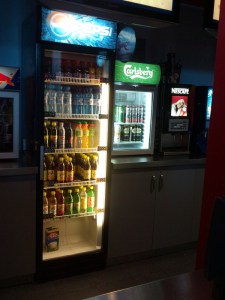 I did however see an interesting thing at the theater itself. I was pleasantly surprised to see what you can also see below. What’s that at the concession stand next to the soda fridge? That’s right, BEER! I have gotten used to KFC and McDonalds serving beer with any meal, but have never seen beer served at the movies. Too bad I drove a car there 😦