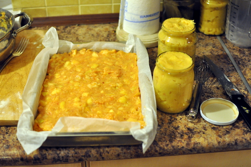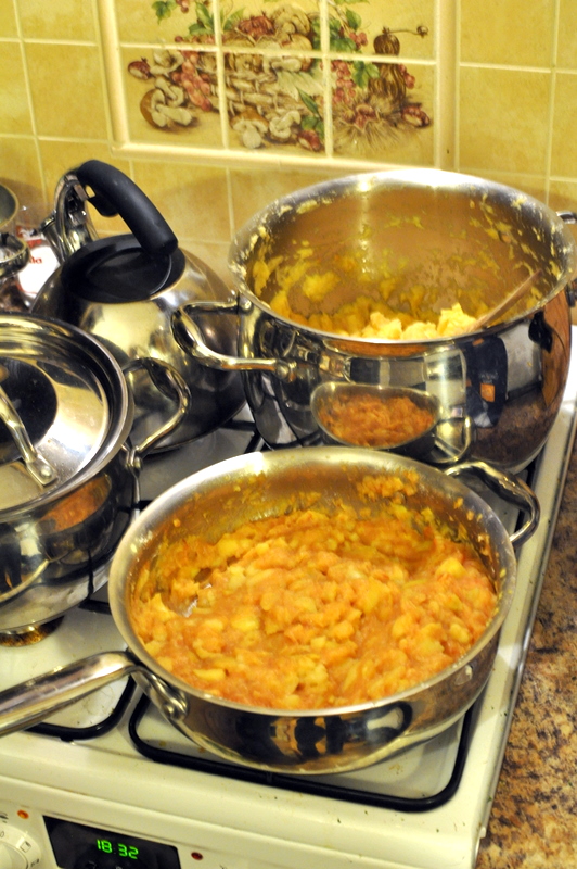 First of all quince is a very hard fruit, almost seems like a very hard pear, only much bigger, and it took some muscle to cut it all up. Once done, I stuffed two jars full of quince pieces and covered it with sugar. This was done for my home made ‘nalewka’. After a couple of weeks in the jar, I will add some 96% alcohol and it should be ready just in time for the long winter evenings. The rest I threw into a big pot and cranked up the heat. It’s pretty amazing how a rock solid fruit just gives in to the heat. After about 45 minutes of constant stirring while adding sugar until it tasted just right I was left with a quince jam. Karolina and I decided to make a cake with a part of it, and jar the rest.