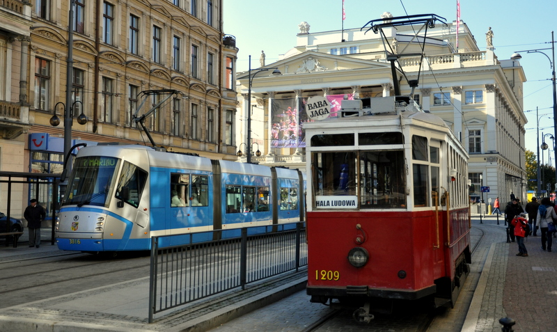 Shown here is the oldest with the newest. Almost one hundred years apart, the latest and greatest streetcars in Wrocław are made by Skoda in the Chech Republic.