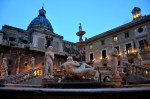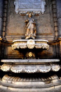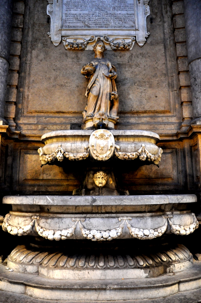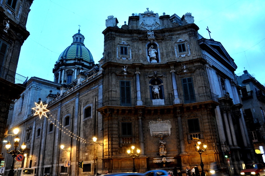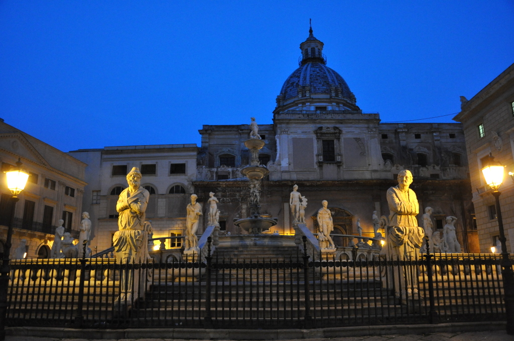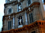 The time of day was not if our favor and it was pretty dark by the time we got to Quattro Canti, an intersection laid out in 1608 dividing Palermo into four sections. Buildings on that intersection bare fountains and statues of the four seasons, the four Spanish kings of Sicily, and of the patronesses of Palermo (Cristina, Ninfa, Olivia, and Agata). This according to Wikipedia info I have found. From there we walked over to the Piazza Pretoria, planned in the 16th century. Perhaps age alone could stand for why it all looked in desperate need of attention. Beautiful as it was, it also looked like it literally hasn’t been touched in 400 years.