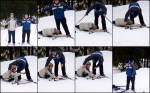 I’ve skied before so I know the way to stop or slow down is to do the plow thing, but not once your skis are two inched deep in narrow grooves especially made for this sport. Once you’re in, it’s hard to get out of the grooves under regular flat conditions, and especially hard going down hill. Bam.