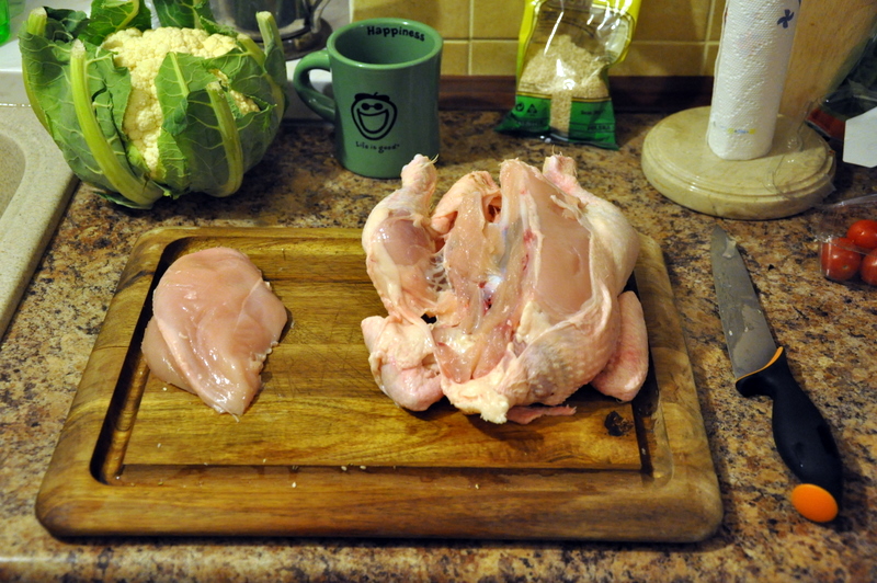 Oddly enough it turns out buying a whole chicken here is less expensive then getting just the boneless/skinless chicken breast. Almost half the price actually, depending on the size of the chicken. I’ve been getting whole chickens ever since simply due to the amount of meat I get per chicken as opposed to just getting the breast. Gotta count the dollars these days since I’ not actually earning any at the moment.