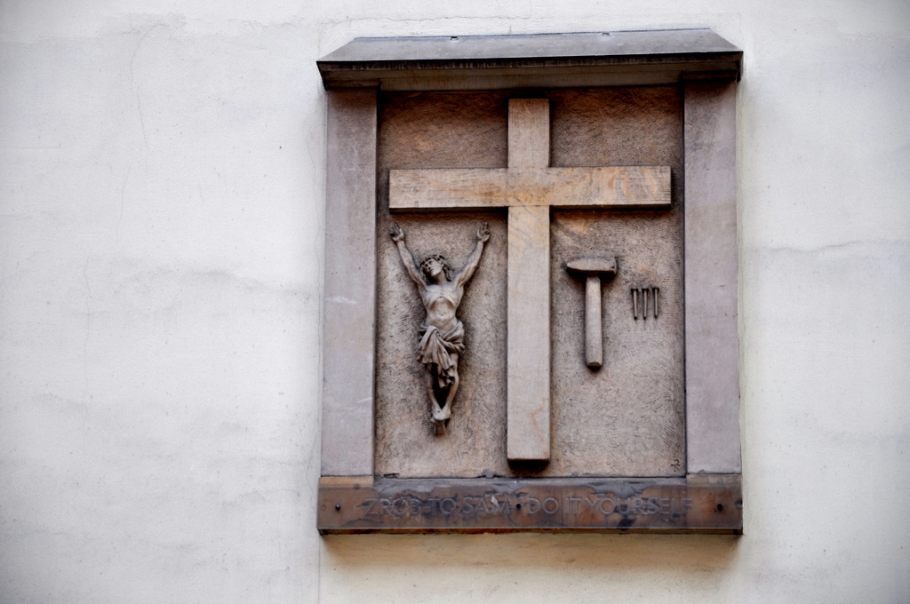 Posted on a wall in the corner of Wrocław’s Market Square is a very controversial piece of art. Signed simply “Zrób to Sam” with an English translation “Do It Yourself”, the sculpture represents Jesus Christ, a cross, nails, and a hammer, asking us the viewers to follow through on the rest.