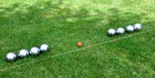 The small graphic on the left explains what the idea is; get your ball the closest to the yellow Jack, also known as ‘the piglet’. Now that I read a little about the game I believe we’re twisting a few rules in our back yard edition. Like the fact that in pétanque you’re supposed to be standing in a circle and not only behind a line as we do, but the game is no less fun, believe me. To make things a little more interesting we play two separate tournaments, each with a different prize set.