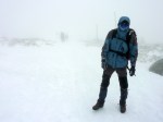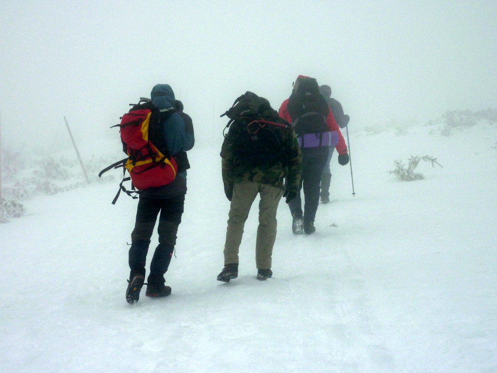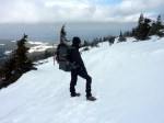 Wind was blowing fairly strong as we took off to continue our journey to the mountain top. It wasn’t a long hike but it was steep and the wind did not let go. The thick snow layer was mostly frozen so it made for a good walking surface but we still occasionally fell knee deep into air pockets beneath making each step pretty interesting.
