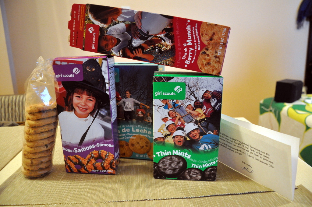 No name on the box but a return Glendale address and girl scout cookies inside made it all too clear. Upon opening the box a letter explained it all: to avoid cookie obesity Phil decided to send out a few boxes to the furthest corner of the world he actually had an address to. I won!