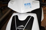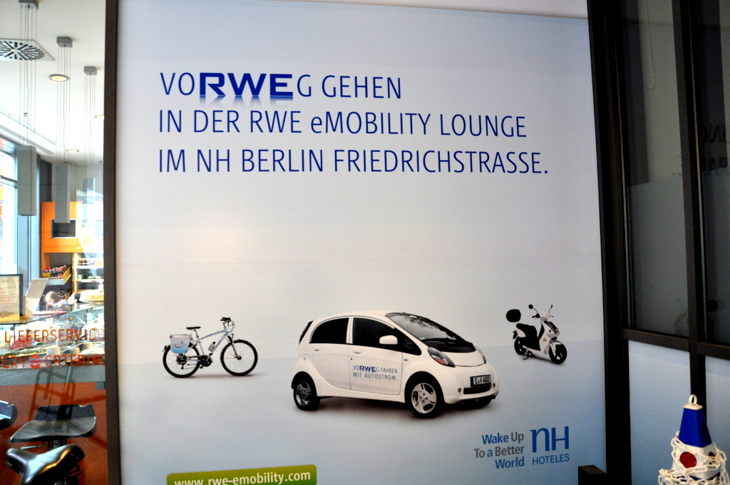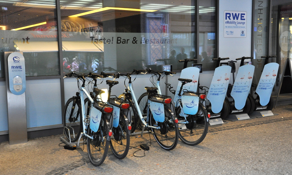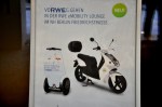 We took the metro towards Berlin’s museum island exiting at the Friedrichstrasse station. The first thing that caught my eye right after leaving the station was an RWE e-Mobility Lounge, and most importantly, our GO!S scooter grazing at the charge station. I’m sure to someone who’s worked on Volskwagens the joy of seeing another Volskwagen is pretty mute since chances are there’s a VW parked nearby. But with me that is not the case. With hands on knowledge of the scooter, it is pure pleasure to see it out in the world making a difference once charge at a time. Our GO!S line has changed a bit since the model seen above; hydraulic disc brakes in the rear and new front brakes with flower like discs are the two most visible changes.