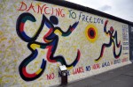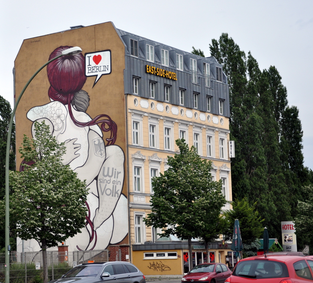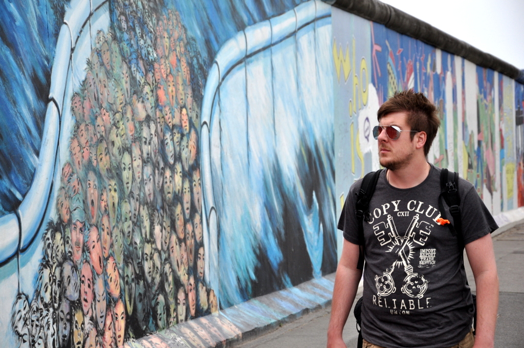 Naturally the Wall has never been linked to anything positive, except for the day it was torn down, and it felt pretty good to walk along it and decode the message of freedom and hope as shown through the murals. There are a few famous ones that you can see on shirts and posters long before ever getting to the East Side Gallery, the above Trabi painting is one of them, and the Fraternal Kiss between Brezhnev and Honecker is another. I’m pretty certain our kiss is not politically correct, but it was still a much smaller smooch than the one painted behind us.