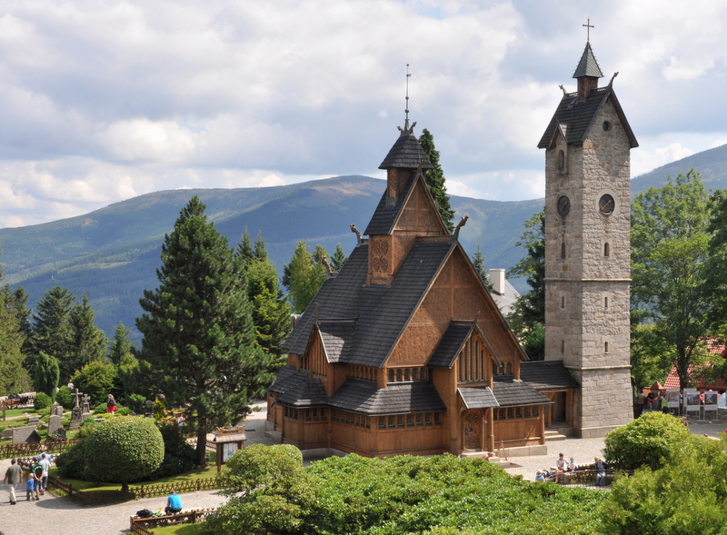 From the parking we hiked up to the Wang (Vang) church, an old Norwegian church from the city of Vang that was disassembled in 1842, brought over from Norway, and then reassembled again here in Karpacz. We’ve never been inside, but from the outside it looks pretty amazing. The national park entrance is right next to it, and after we bought our passes, we hiked on to the Samotnia shelter.