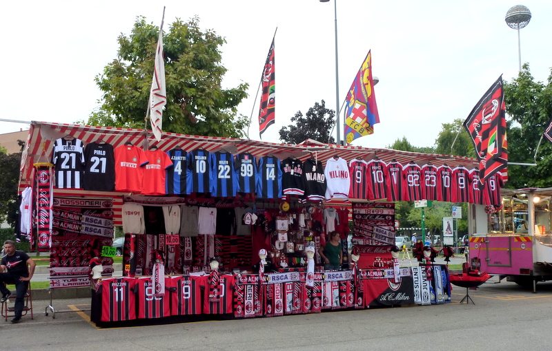 We managed to follow proper Milan fans toward the correct ‘friendly’ section and were greeted by all kinds of booths selling fan gear, food, and beer. There was plenty to choose from and Krzysiek bought his 8 month old son an AC Milan sweatshirt. So young and already a fan.