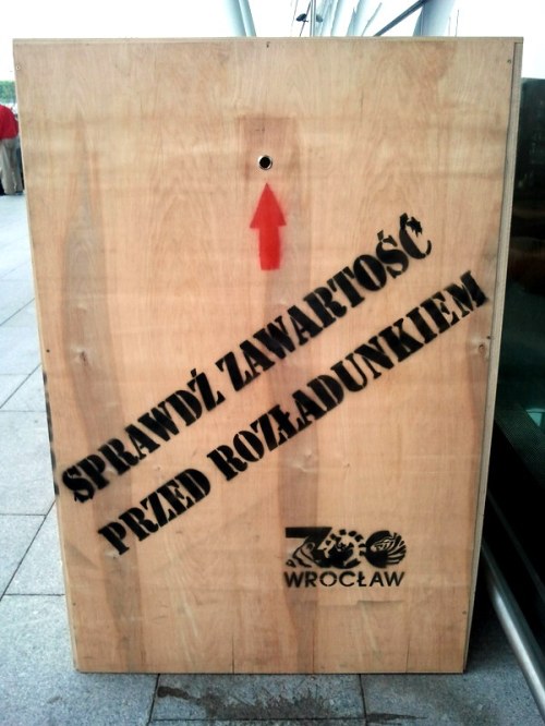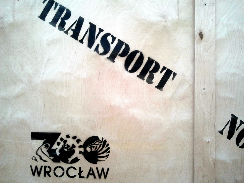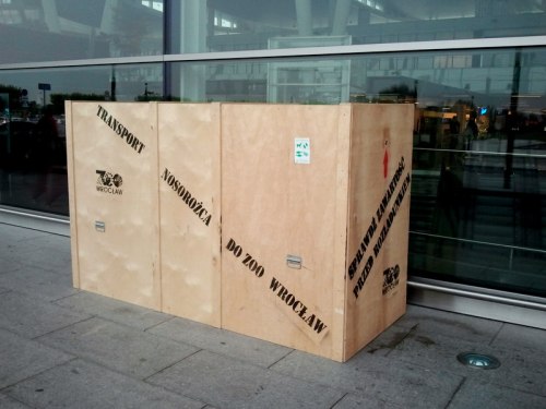 If you happened to fly in or out of Wrocław’s international airport, you might have noticed a rather large wooden crate casually placed outside the main terminal door. The crate has a big Rhino Transport sign written on it in Polish to avoid any confusion as to what the big box is for.