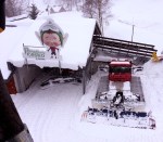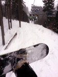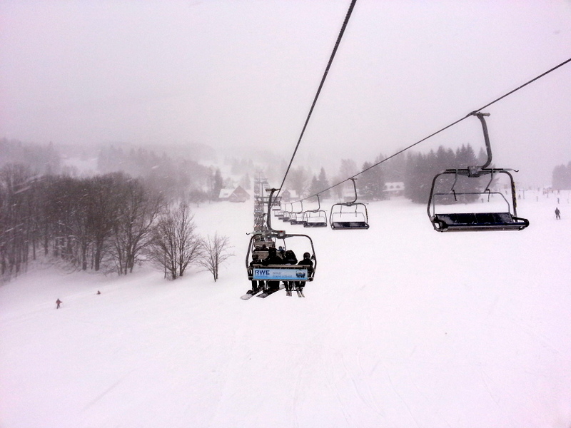 Because of high wind the longest lift was closed which greatly limited lift options for me. There are two types of lifts in Rokytnice; the standard chair lift, and a “hold-on-to-a-pole-while-it-drags-you-up-the-mountain” lift, better known as the Poma lift or a platter pull. That latter kind is extremely easy for skiers, you put the pole in your crotch area and up you go. Not so easy when standing sideways on a board. As soon as the pole grabbed me I fell face first into the snow. Trying not to think of all the people that just saw me eat it I limped back to the lift and tried again. The second time I managed not to embarrass myself, but it was the longest lift ride of my life and I still ate snow at the top while I tried to unhook the pole from between my legs. One must have extreme balance and control over a snowboard to keep it steady while going up, not down, the mountain. I’m just learning that now. That single lift ride up was enough to keep me away from that side of the mountain the rest of the day.