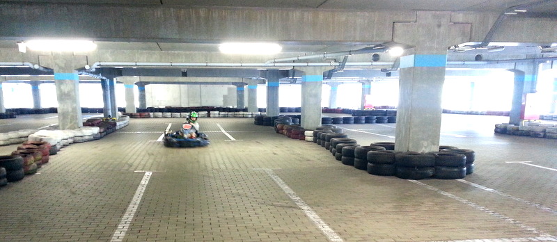This of course leaves the multistory parking lot next to it really really empty. Fortunately someone saw this as a good thing and put a gokart rink on the bottom floor. Although the surface is made of a brick like cobblestone, the track is still pretty fast and a lot of fun, too.