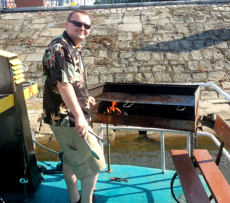 The boat cruise chugs along at a very slow pace, just slow enough for the grill to get going. I landed the grill duty even though it took a higher engineering power to lower the cooking grate. Good thing we’re an engineering company 😉 I introduced my group of folks to my standard, a grilled corn on the cob. I think it has to be an American invention because no one here ever thought of putting a leafed corn cob on a grill.