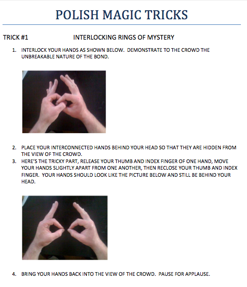 My sincere apologies to those looking for an actual Polish magician. The title of this blog came about a couple of days before I left Los Angeles during a good bye dinner. While someone said “you need a blog to keep us up to date” someone else had shown me a couple of Polish magic tricks as explained in detail in the instructions below, and thus the Polish Magician was born.